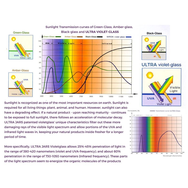 ULTRA JARS violet glass jars are made to last. With a thicker European glass, they are 10 - 20% thicker than standard glass jars. The patented ultraviolet glass blocks out harmful visible light, allowing in only beneficial, reinvigorating UV-A, violet and infrared light rays to energise and protect your natural products inside, ensuring they will be safe, potent and fresh for up to 2 years or longer