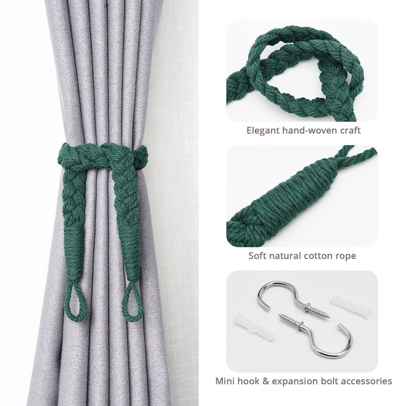 Pretty Jolly 2 Pack Natural Cotton Rope Curtain Tiebacks Elegant Boho Style Decorative Drape Tie Backs Soft Hand-Woven Rope Curtain Holdbacks with Metal Hook for Home & Office Drapery (Dark Green)